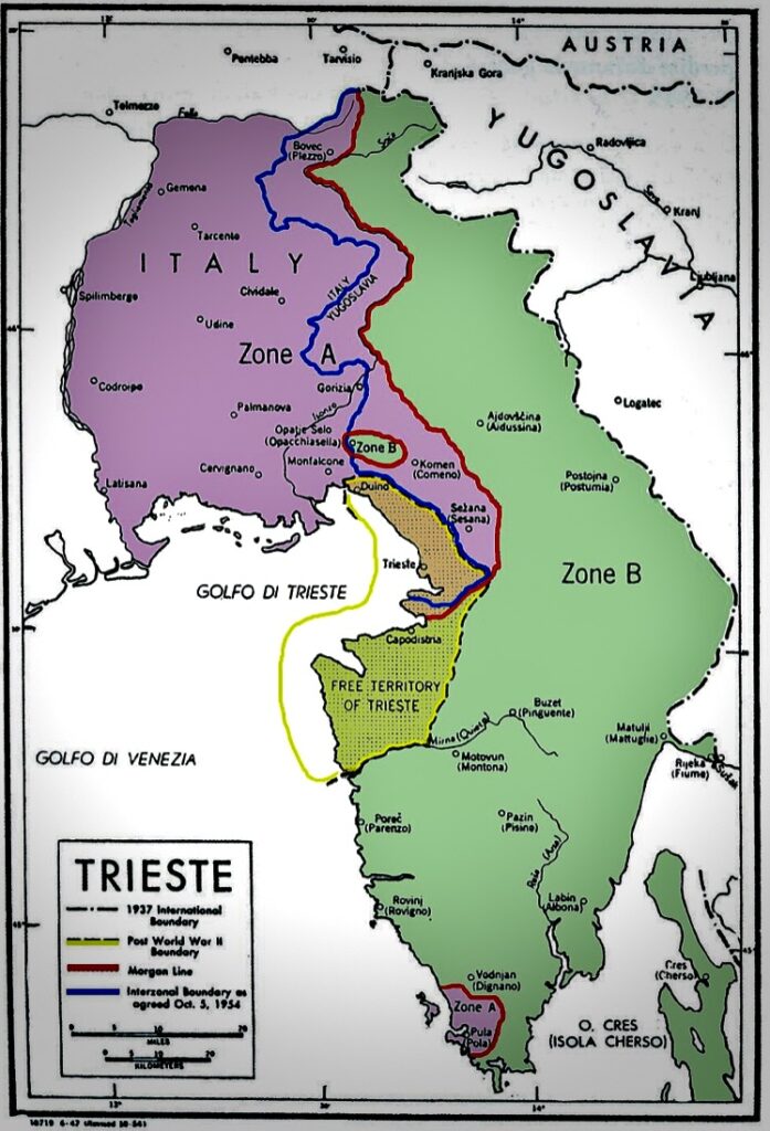 Ci volle un pesante bombardamento alleato per convincerli alla ritirata a seguito della quale i primi ad arrivare a Trieste furono i reparti al comando di Tito sostenuti dalle brigate partigiane comuniste italiane che, insieme, presto assunsero il controllo di gran parte del Friuli Venezia Giulia, una situazione che, ovviamente, non poteva piacere agli Anglo-americani i quali, sotto pressione di Churchill, il 9 giugno convocarono un incontro a Belgrado per sistemare questa piccola, ma fortemente simbolica porzione di territorio italiano riconquistato a seguito della vittoria della Prima guerra mondiale. I diplomatici divisero con una sorta di “muro” (Linea Morgan) il territorio triestino lungo il corso del fiume Isonzo e fino a est/sud-est della città di Muggia dando luogo ad una Zona A, che includeva Trieste e Gorizia amministrata militarmente dagli anglo-americani, ed una Zona B, amministrata dai generali jugoslavi.
