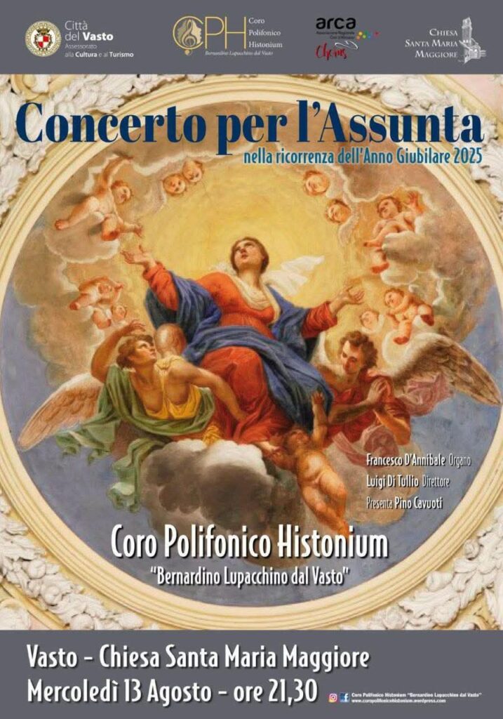 Questa sera, mercoledì 13 agosto, alle 21:30, nella chiesa di Santa Maria Maggiore a Vasto il coro polifonico Histonium presentera’ dei brani dedicati alla Vergine Assunta.