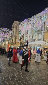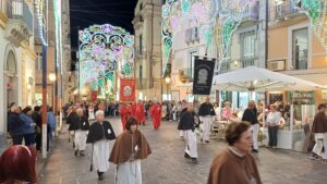 Condividi Con la processione in onore di San Michele Arcangelo, Patrono della Città del Vasto, si sono praticamente conclusi i festeggiamenti organizzati dall’Amministrazione Comunale della Città, in collaborazione con il clero cittadino. Alle ore 18,00, all’interno della Chiesa di Santa Maria Maggiore Mons. Bruno Forte ha presieduto una solenne celebrazione eucaristica concelebrando assieme al Nunzio Apostolico, Mons. Mauro Lalli, il vicario episcopale Don Nicola Del Bianco ed i sacerdoti delle Parrocchie vastesi e della Diocesi. Il sacro tempio era strapieno di fedeli accorsi per ascoltare la parola del proprio Vescovo il quale ha pronunciato una esaltante omelia con chiari riferimenti al difficile momento che il mondo intero sta vivendo. Presenti le massime autorità Civili e Militari della Città capeggiati dal Sindaco Francesco Menna. Al termine della celebrazione del rito religioso si è formato il corteo che ha percorso le strade del centro storico cittadino tra due ali di folla. Come sempre hanno animato la processione i rappresentanti delle Confraternite cittadine che hanno portato a spalla la sacra effige di San Michele Arcangelo. La processione, come da tradizione, si è conclusa nello splendido belvedere che si apre sul golfo della città e dove si erge la Cappella dedicata al Santo Patrono Michele. Mons. Forte ha invitato i presenti a pregare per quanto sta accadendo nella striscia di Gaza e nella martoriata Ucraina impartendo, poi, la sua paterna benedizione. Processione San Michele