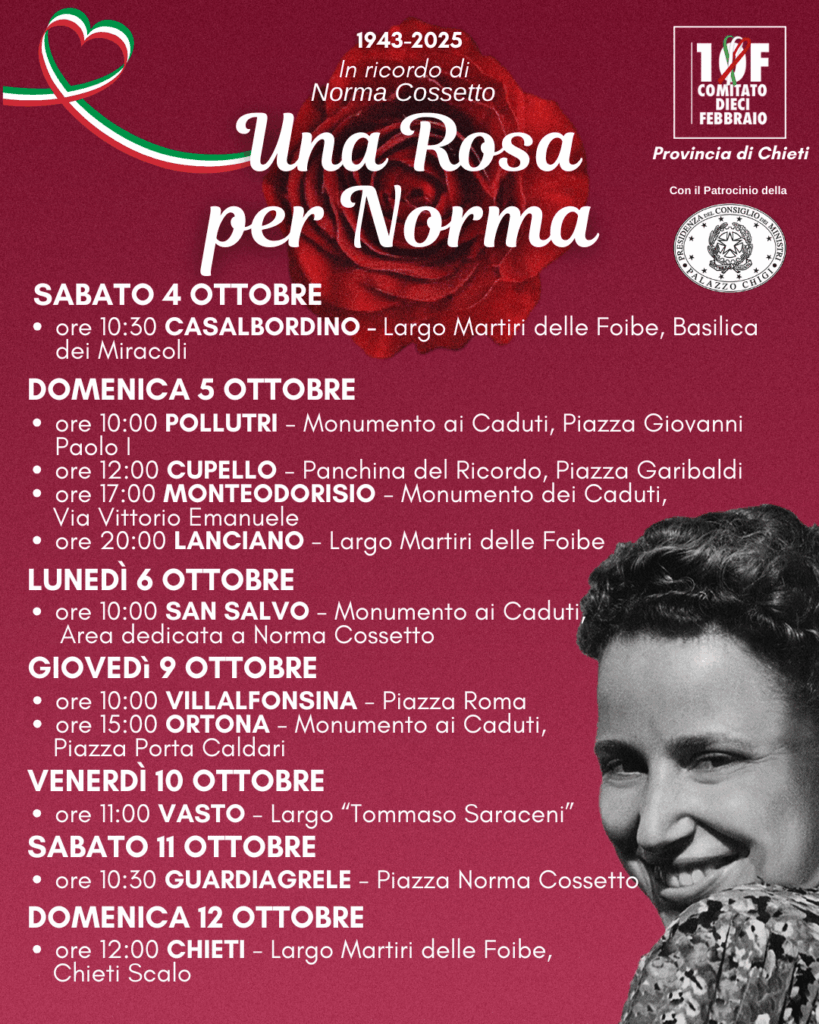 Il Comitato 10 Febbraio della Provincia di Chieti promuove la manifestazione patriottica “Una Rosa per Norma”, giunta alla settima edizione, dedicata alla memoria di Norma Cossetto, giovane studentessa istriana, Medaglia d’Oro al Merito Civile, vittima delle violenze e della barbarie delle foibe nel 1943.
