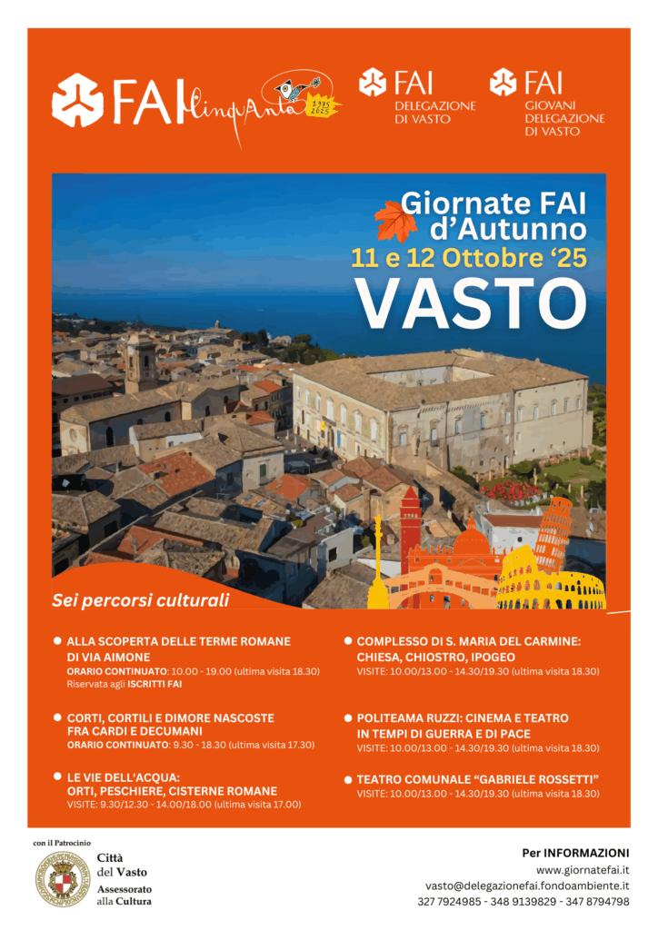 La Delegazione FAI di Vasto, in occasione del 50° anniversario della Fondazione, ha scelto Vasto quale protagonista delle Giornate FAI d’Autunno, proponendo al grande pubblico sei magnifici percorsi culturali, tutti nel centro storico.