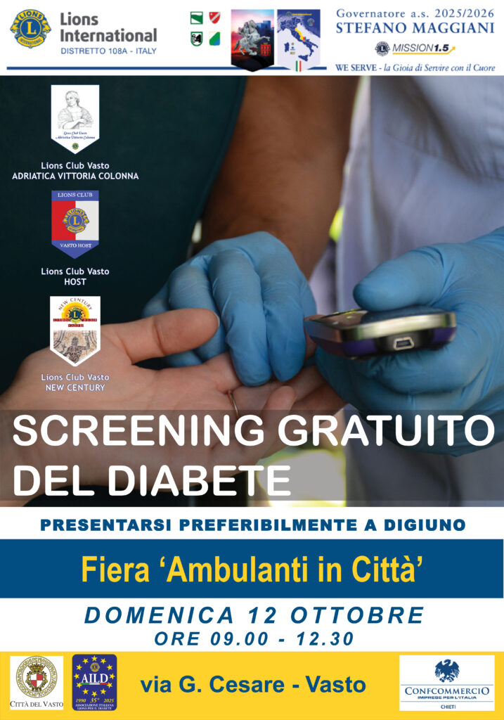 I Lions Club Vasto Adriatica Vittoria Colonna, Vasto Host e Vasto New Century promuovono, con il patrocinio di AILD-Associazione Italiana Lions per il Diabete, lo screening gratuito della glicemia, service globale del Lions International in un momento in cui il diabete ha assunto i connotati di una pandemia.