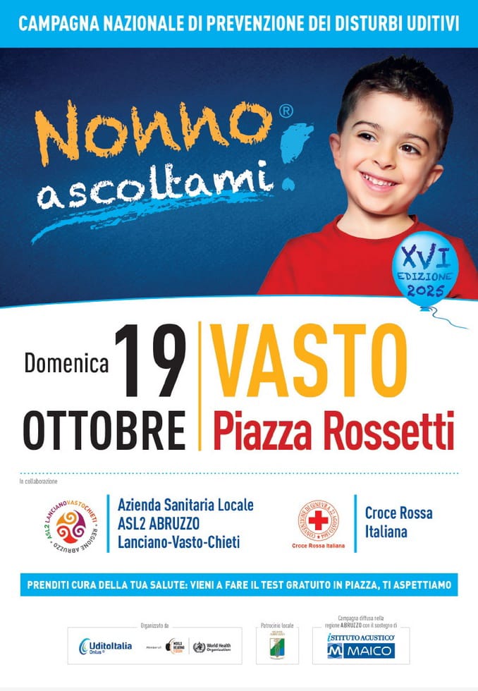 «La tappa di “Nonno Ascoltami!” a Vasto – dichiarano il sindaco Francesco Menna e l’assessore alle Politiche sociali Anna Bosco – è una bellissima opportunità per promuovere la prevenzione. Grazie all’organizzazione “Udito Italia” in collaborazione con la ASL2 Abruzzo Lanciano-Vasto-Chieti, alla Croce Rossa Italiana, Regione Abruzzo per questa edizione che ci ricorda quanto sia importante prendersi cura della propria salute uditiva. Continuare a promuovere la prevenzione significa regalare benessere e qualità di vita, soprattutto ai nostri nonni, che invitiamo a partecipare».