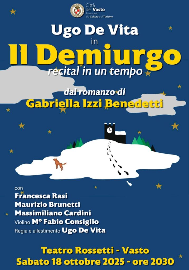 I soci della Società Vastese di Storia Patria annunciano che il recital “Il Demiurgo” tratto dal romanzo omonimo scritto dalla presidente Gabriella Izzi Benedetti (Bulzoni 2004), approderà anche a Vasto dopo il grande successo ottenuto a Firenze a giugno scorso.