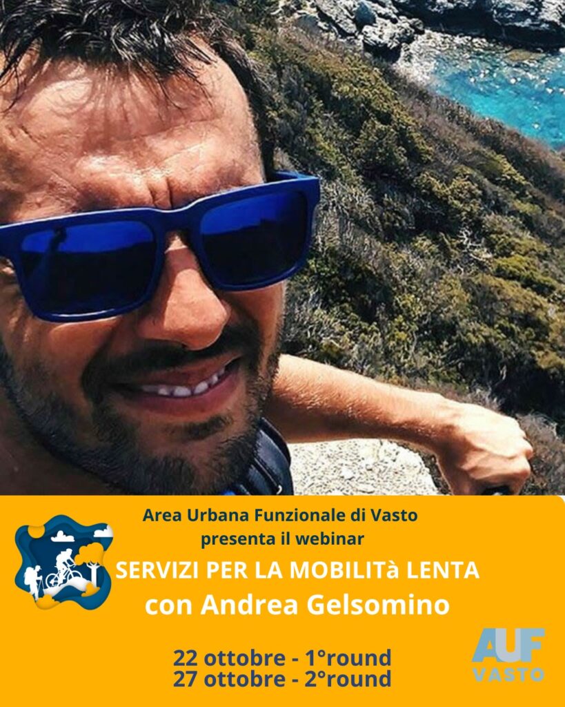 Dopo Cicloturismo e Mobilità lenta e cammini, il ciclo di webinar dell’Auf-Area urbana funzionale di Vasto, si occupa ora dei Servizi per la mobilità dolce. Due appuntamenti: il primo domani mercoledì 22 ottobre e poi lunedì 27 per la seconda parte. Gli incontri sono con Andrea Gelsomino, conduce Paolo Grigolli. Sempre dalle 17,30 alle 19 con partecipazione gratuita, iscrizione online al link https://bit.ly/webinar_