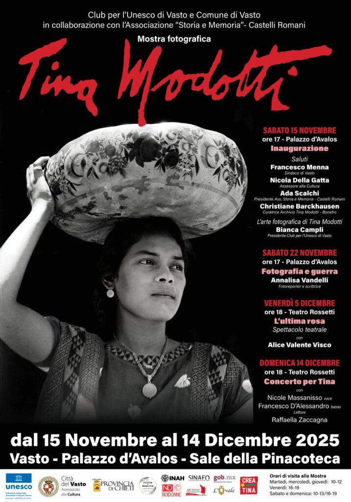 – sabato 15 novembre alle ore 17:00 a Palazzo d’Avalos, inaugurazione con l’illustrazione dell’arte fotografica della Modotti a cura di Bianca Campli, Storica d’arte, Presidente del Club per l’Unesco di Vasto, il saluto della curatrice della mostra Ada Scalchi, Presidente dell’Associazione “Vita e Solidarietà- Castelli Romani” e della Presidente dell’Archivio Tina Modotti di Bonefro, Christiane Barckhausen Canali.