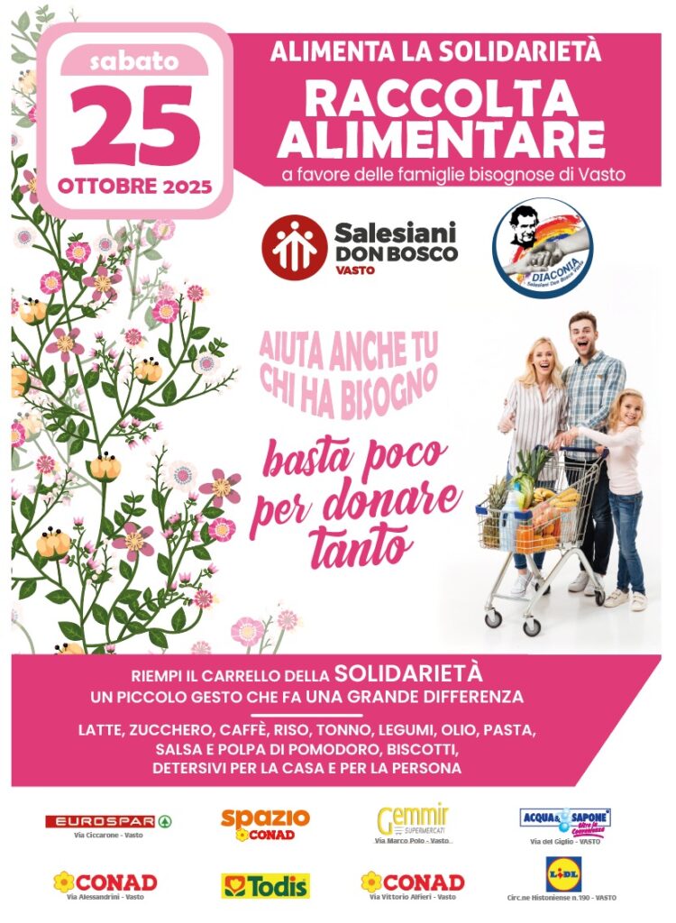 Sabato 25 Ottobre torna il secondo appuntamento annuale con la Raccolta Alimentare organizzata dalla Parrocchia San Giovanni Bosco di Vasto a favore di tante famiglie bisognose del territorio. Per questa iniziativa si alterneranno insieme i vari volontari della comunità salesiana coordinati dal gruppo interparrocchiale della Diaconia che dal 2010 si prodiga donando pacchi alimentari alle famiglie meno abbienti, offrendo anche servizio di microcredito con pagamento bollette utenze ai nuclei in difficoltà. Sono otto quest’anno i punti vendita della città dove per tutta la giornata saranno presenti i gruppi associativi per raccogliere alimenti e prodotti di prima necessità che verranno poi immagazzinati, stoccati e distribuiti alle famiglie in stato di bisogno e consegnati direttamente presso la Parrocchia San Giovanni Bosco.