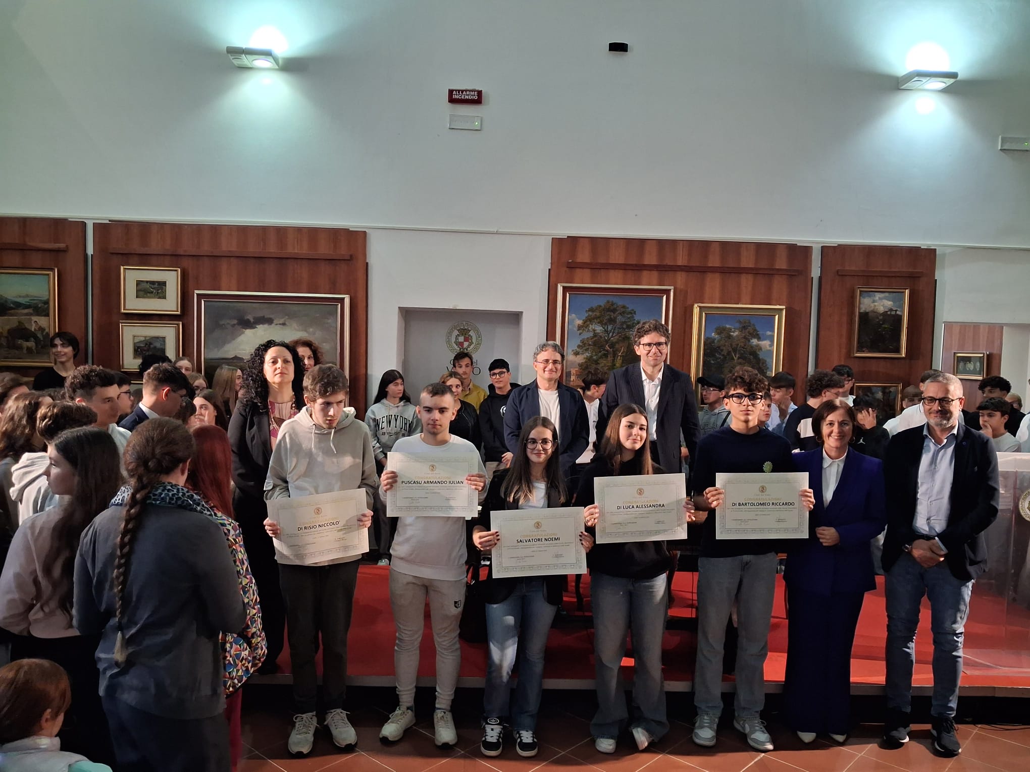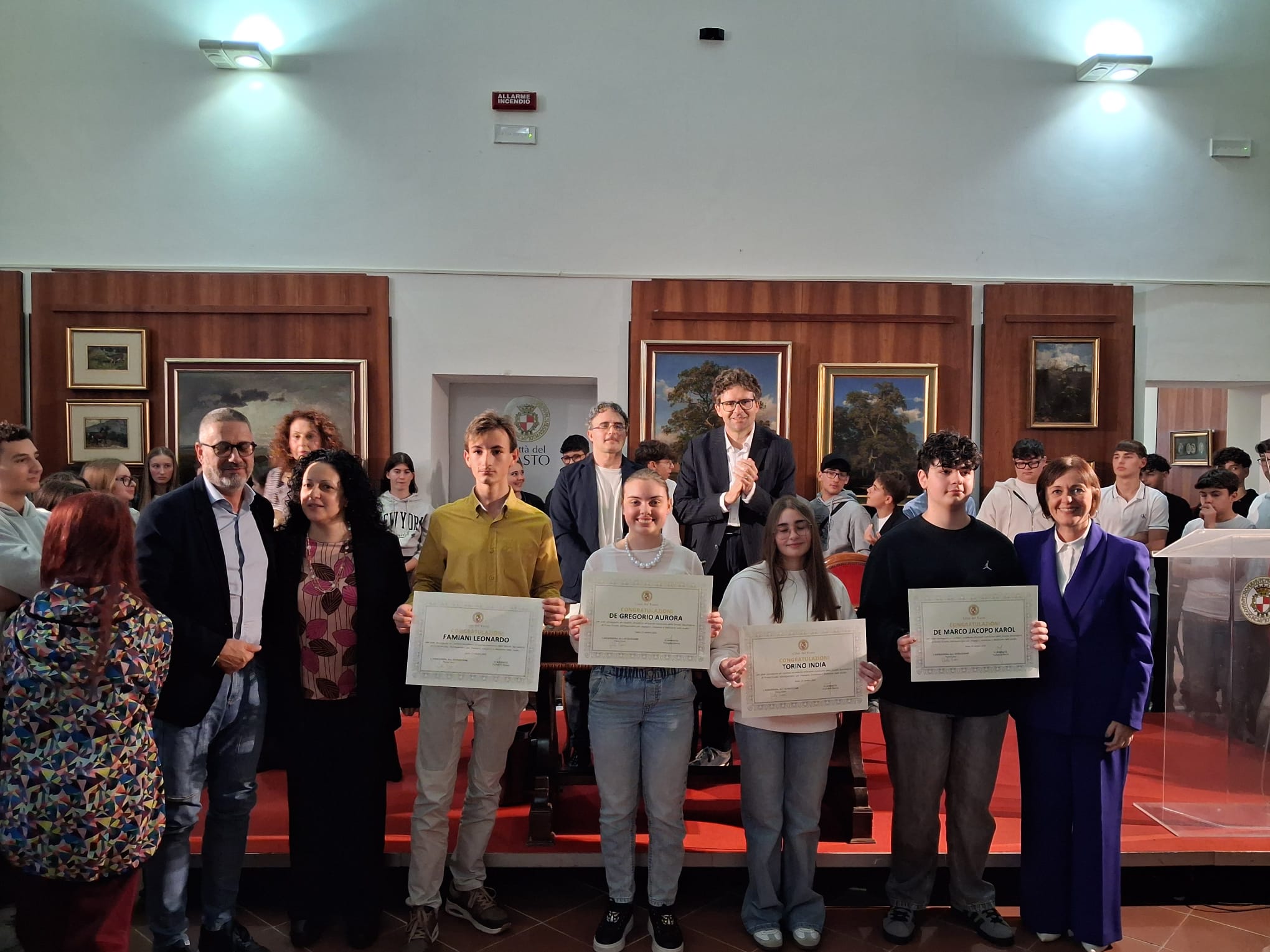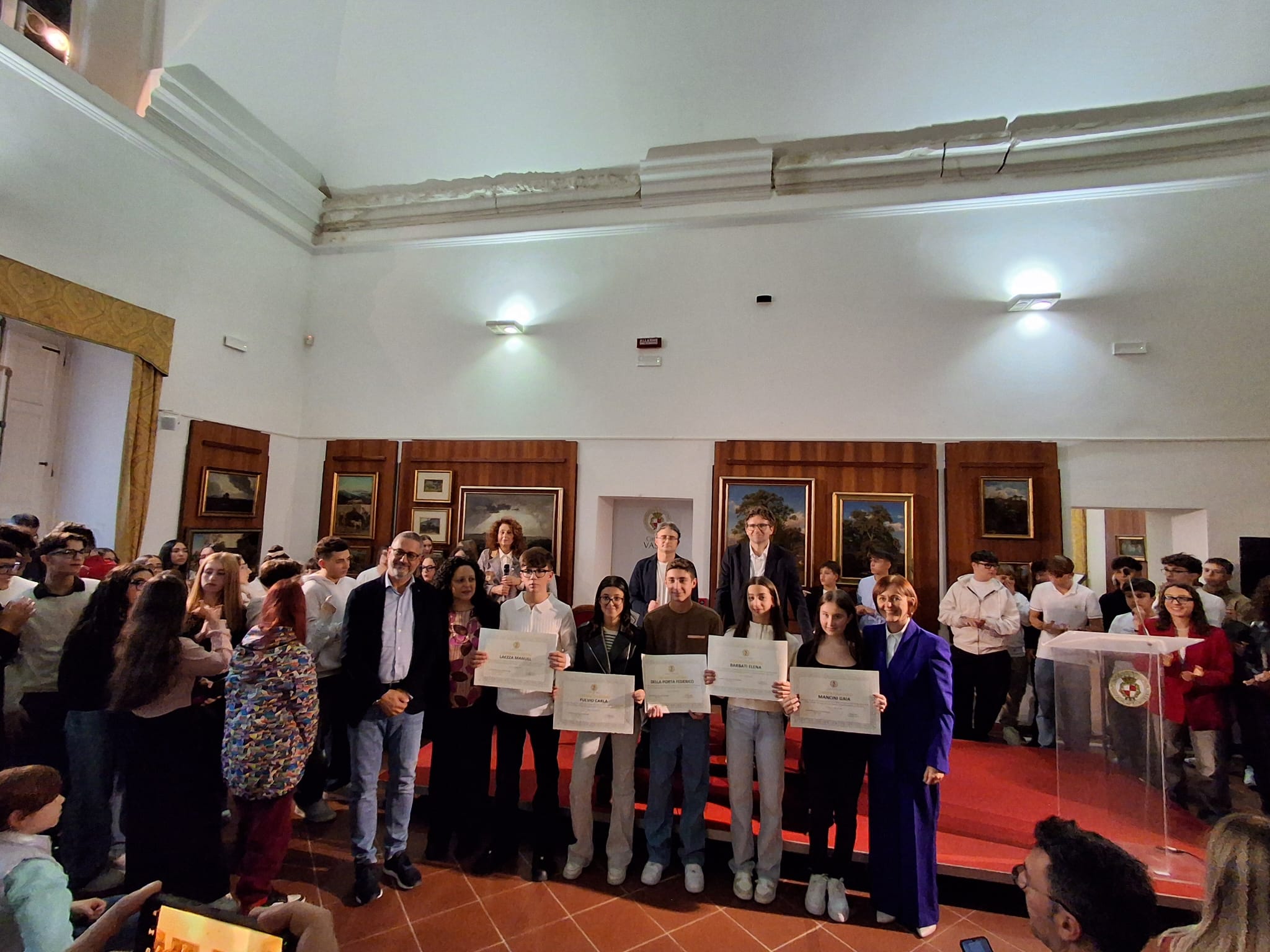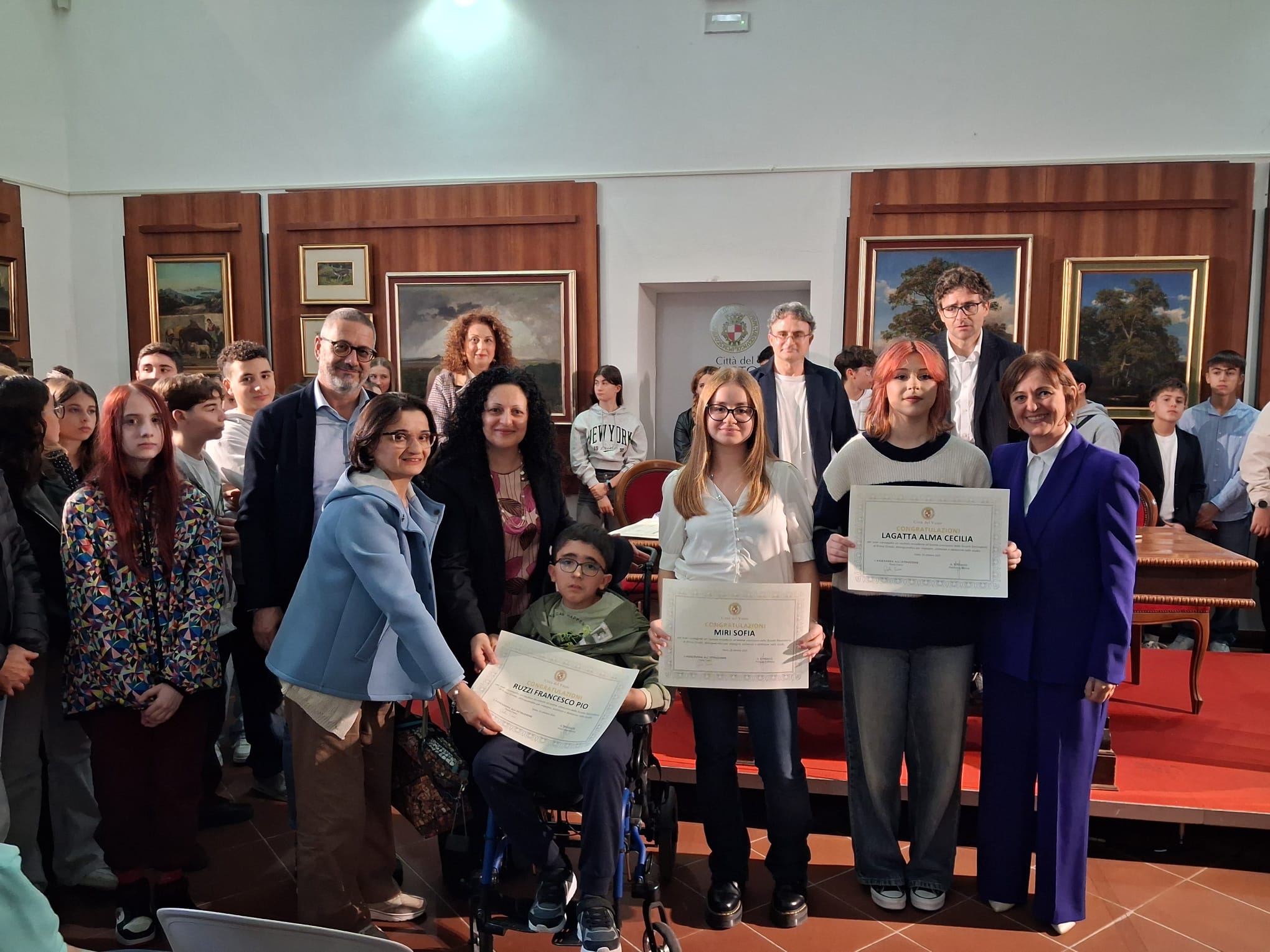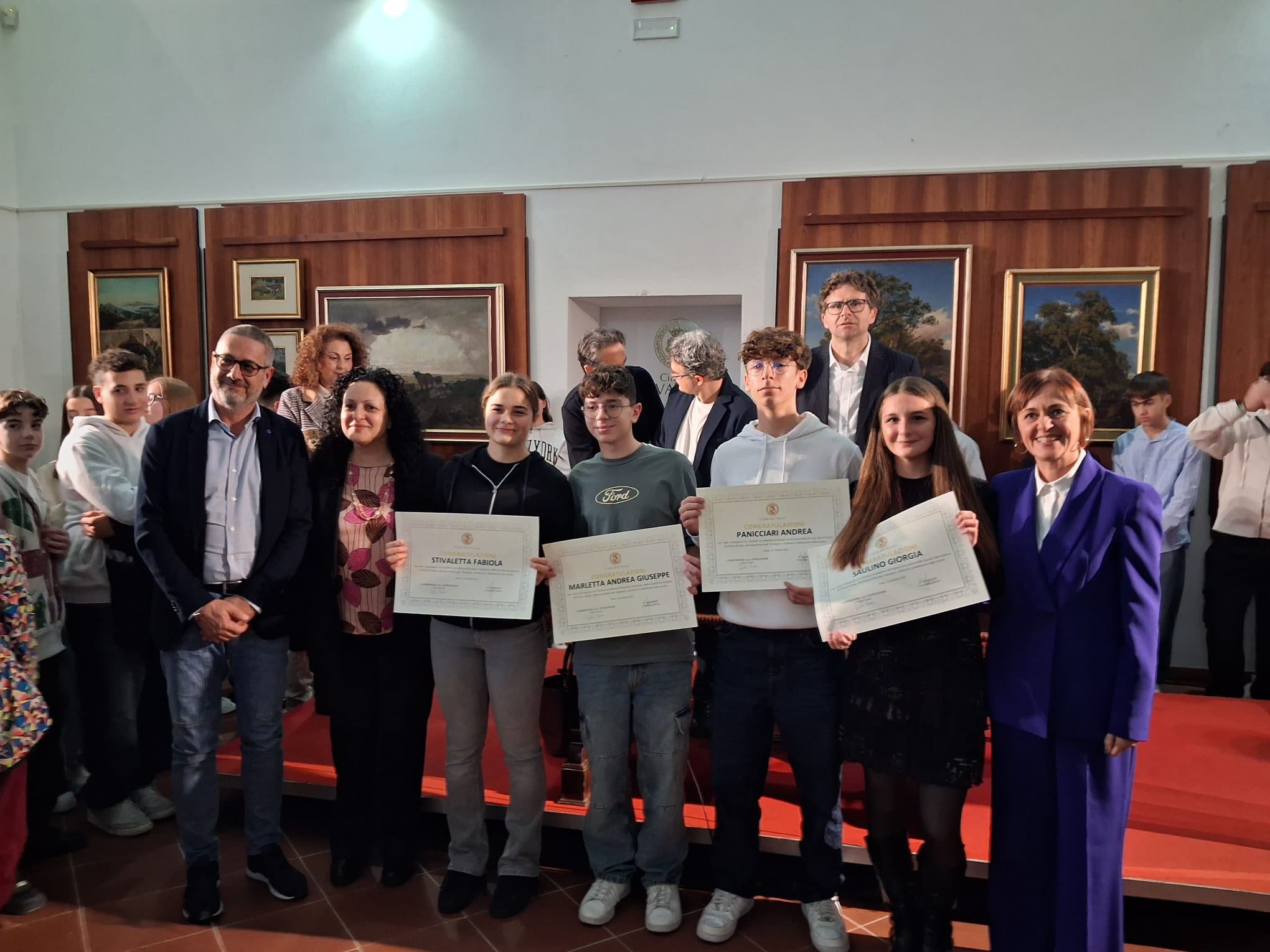 La Pinacoteca di Palazzo d’Avalos ha ospitato ieri pomeriggio, 25 ottobre 2025, una cerimonia ricca di emozione: la premiazione degli studenti e delle studentesse che hanno conseguito il massimo dei voti all’esame conclusivo della Scuola Secondaria di Primo Grado (anni scolastici 2023/2024 e 2024/2025).