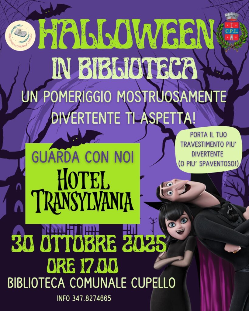 In vista di Halloween, la Biblioteca Comunale si trasforma in un luogo magico e un po’ misterioso per la proiezione del film d’animazione Hotel Transylvania, una storia piena di risate, mostri buffi e avventure incredibili!