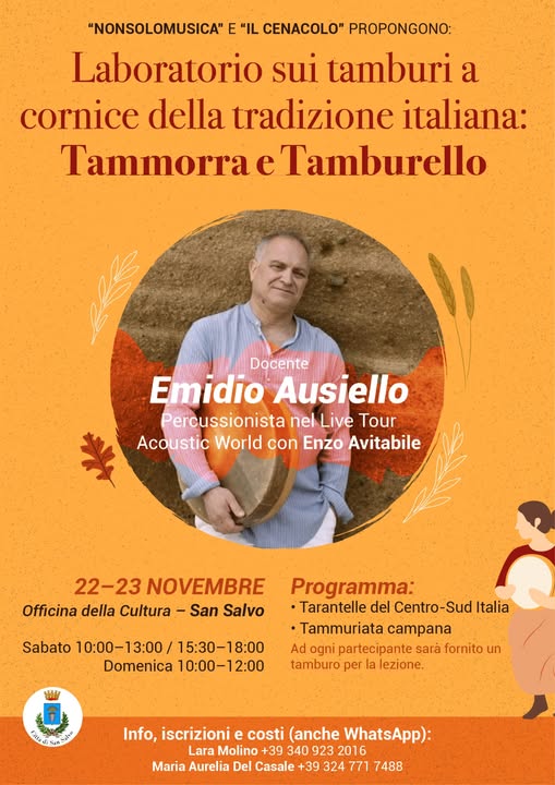 Presso l’Officina della Cultura (ex mercato coperto) si terrà infatti il primo laboratorio dedicato ai tamburi a cornice della tradizione popolare italiana – tammorra e tamburello – condotto dal Maestro Emidio Ausiello, rinomato percussionista e docente, collaboratore di artisti del calibro di Enzo Avitabile, Beppe Barra, Eugenio Bennato e Teresa De Sio.