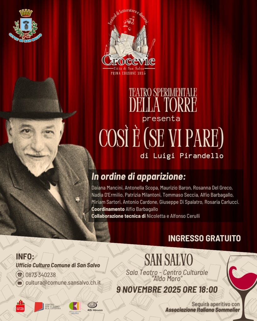 Un grande classico del teatro italiano torna sul palcoscenico grazie alla compagnia Teatro Sperimentale della Torre, che presenta “Così è (se vi pare)” di Luigi Pirandello, in scena domenica 09 novembre 2025 alle ore 18 presso sala teatro del Centro Culturale ‘’Aldo Moro” a San Salvo all’interno del Festival di Letteratura e dintorni – Crocevie prima edizione 2025