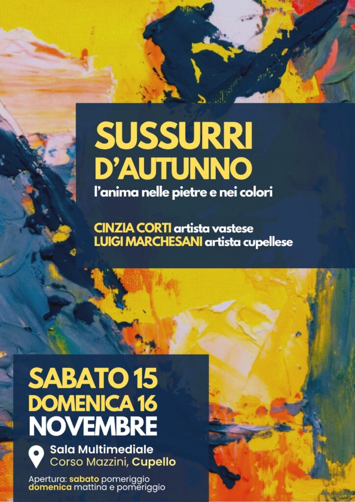Nel suggestivo scenario della Sala Multimediale del Comune di Cupello, presso Corso Mazzini, sabato 15 e domenica 16 novembre si terrà la mostra d’arte “Sussurri d’Autunno – L’anima nelle pietre e nei colori”, un incontro tra materia e sentimento che unisce due sensibilità artistiche del territorio: Cinzia Corti, artista vastese, e Luigi Marchesani, artista cupellese.