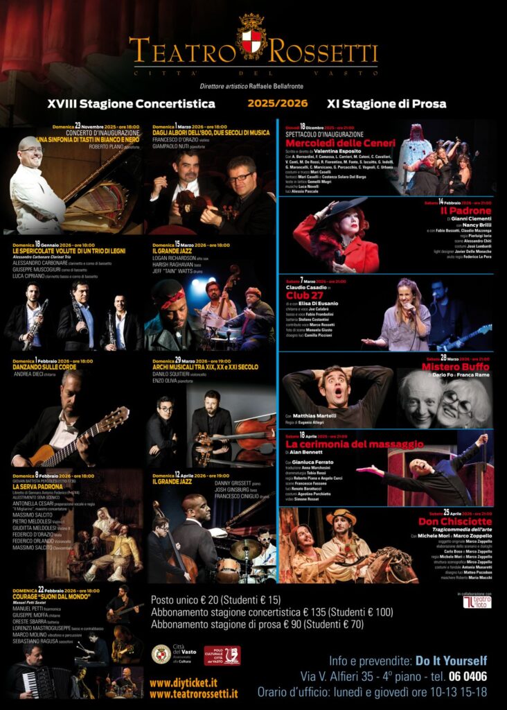 “Soltanto una settimana ci separa dal Concerto di inaugurazione della Stagione Concertistica (domenica 23 novembre alle ore 18:00) che avrà l’onore di accogliere Roberto Plano, uno dei più apprezzati pianisti sulla scena internazionale” dichiarano il Presidente e il Direttore Artistico del Polo Culturale della Città del Vasto, Annamaria Di Paolo e Raffaele Bellafronte. “Poi, secondo il calendario, presenze illustri provenienti da tutto il mondo si alterneranno sullo storico palco del Teatro Rossetti e, come da tradizione consolidata, tanti saranno i linguaggi della musica proposti: dalla musica ‘colta’ al Jazz e alla world music con una infinità di sfumature diverse.”