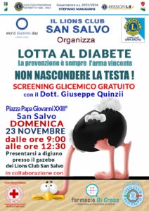 Domenica 23 novembre 2025, per il mese della prevenzione del Diabete, il Lions Club San Salvo sarà presente in piazza Papa Giovanni XXIII, dalle ore 9:00 alle 12:30, con un gazebo informativo e uno screening glicemico gratuito aperto a tutta la cittadinanza.