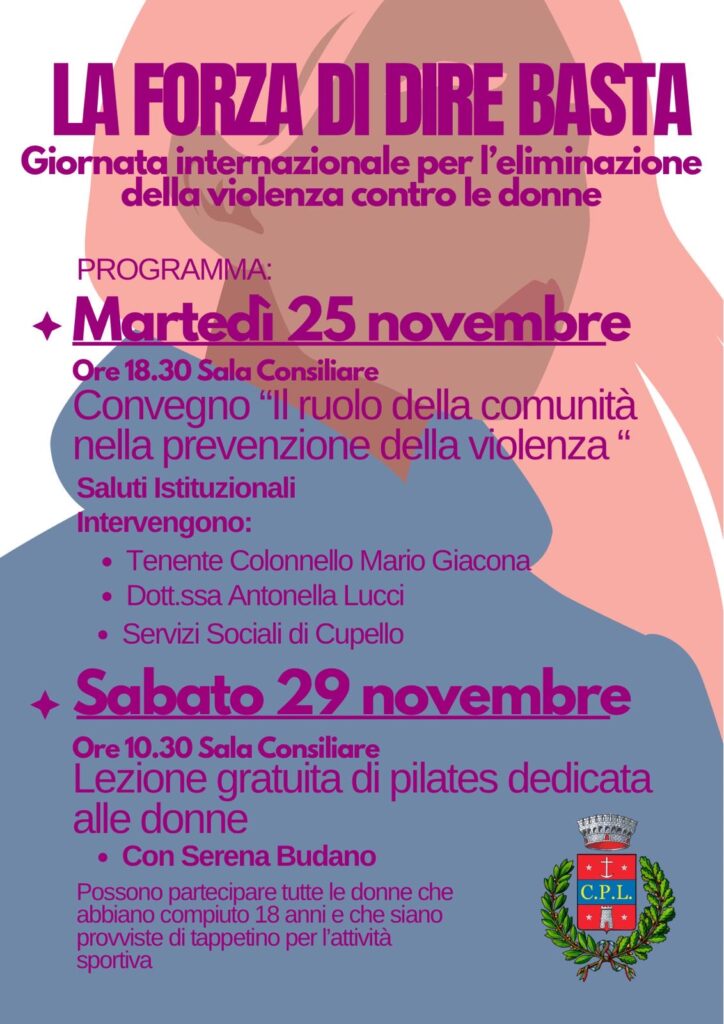 Martedì 25 novembre, avrà luogo il convegno dal titolo “Il ruolo della Comunità” ed interverranno il Tenente Colonnello Mario Giacona, comandante della compagnia dei Carabinieri di Vasto, la dott.ssa Antonella Lucci, psicologa, psicoterapeuta e psiconcologa, il Servizio Sociale del Comune di Cupello per riflettere sull’importanza di fare rete al fine di combattere “una violenza” che ancora fa fatica ad essere superata.