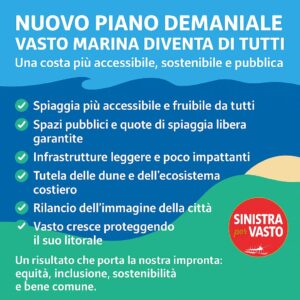 Sinistra per Vasto accoglie con grande soddisfazione l’approvazione del nuovo Piano Demaniale di Vasto Marina, un risultato che rappresenta un passo avanti concreto verso una gestione moderna, responsabile e rispettosa del nostro litorale.