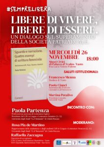 Martedì 26 novembre, alle ore 18:00 presso la Sala dei Musei Civici di Palazzo d’Avalos, si terrà la presentazione del libro 𝙎𝙜𝙪𝙖𝙧𝙙𝙤 𝙚 𝙣𝙖𝙧𝙧𝙖𝙯𝙞𝙤𝙣𝙚 – 𝙦𝙪𝙖𝙩𝙩𝙧𝙤 𝙚𝙨𝙚𝙢𝙥𝙞 𝙙𝙞 𝙨𝙘𝙧𝙞𝙩𝙩𝙪𝙧𝙖 𝙛𝙚𝙢𝙢𝙞𝙣𝙞𝙡𝙚, un dialogo sul superamento della società patriarcale con Paola Partenza, Prof.ssa associata Lettura Inglese e Presidente del CdS in Lingue e Letterature Straniere presso l’Università degli Studi G. d’Annunzio di Chieti-Pescara.