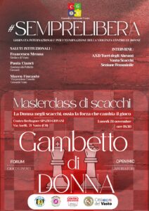Le iniziative di quest’anno inizieranno il 24 novembre con 𝙂𝘼𝙈𝘽𝙀𝙏𝙏𝙊 𝘿𝙄 𝘿𝙊𝙉𝙉𝘼 — 𝙈𝙖𝙨𝙩𝙚𝙧𝙘𝙡𝙖𝙨𝙨 𝙙𝙞 𝙨𝙘𝙖𝙘𝙘𝙝𝙞, alle ore 18:30 presso il Centro Enrico Berlinguer in Via Anelli 71. Sarà un evento formativo e simbolico, realizzato in collaborazione con Vasto Scacchi – Torri degli Abruzzi. Il titolo richiama una celebre apertura scacchistica, trasformandola in metafora di strategia, intelligenza e autodeterminazione femminile. L’iniziativa mira a promuovere la cultura della parità attraverso il gioco degli scacchi, offrendo uno spazio educativo e aggregativo rivolto a giovani, adulti e famiglie. L’ingresso è libero. Saranno presenti per i saluti Istituzionali il sindaco Francesco Menna, l’assessora alle Politiche Giovanili e all’Istruzione Paola Cianci, il vicepresidente della Consulta Giovanile Marco Fiscante e interverranno rappresentanti dell’ASD Torre degli Abruzzi – Vasto Scacchi.
