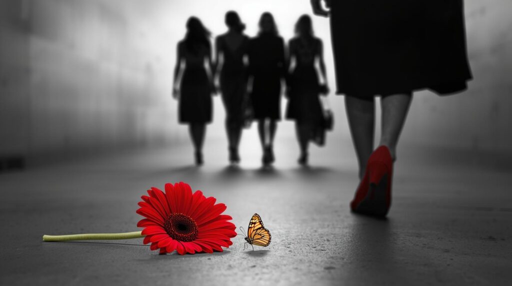 Il rosso parla: è il sangue versato, la ferita che non si dimentica e la forza di chi rompe il silenzio, questo fiore è un monumento alla memoria per chi non ha avuto voce, ed è una promessa affinché nessuna donna debba più trasformarsi per salvarsi, né spegnersi per continuare ad esistere.