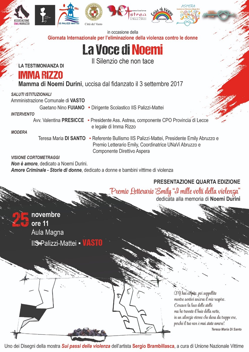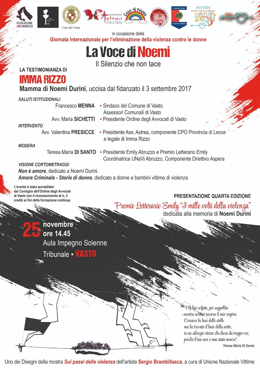 “La voce di Noemi. Il silenzio che non tace” è il titolo del convegno che si terrà a Vasto: al mattino, dalle ore 11 presso l’Aula magna dell’Istituto di Istruzione Superiore “Palizzi-Mattei”; nel pomeriggio, dalle ore 14:30 presso l’Aula Impegno Solenne del Tribunale.