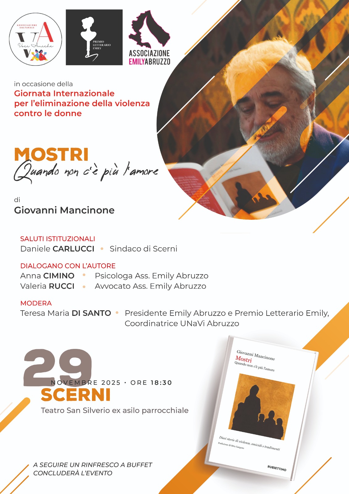 La cultura che si erge contro la violenza sarà protagonista anche di un altro incontro targato Emily Abruzzo, in collaborazione con l’Associazione culturale scernese Voci amiche: quello che avrà luogo sabato 29 novembre presso il Teatro San Silverio (ex Asilo parrocchiale) a Scerni. Qui si terrà la presentazione del libro Mostri. Quando non c’è più l’amore del giornalista e scrittore Giovanni Mancinone, terzo classificato della seconda edizione del Premio Letterario Emily. A dialogare con l’autore Teresa Di Santo e due volontarie dell’Associazione Emily, la psicologa e psicoterapeuta Anna Cimino e la dottoressa Valeria Rucci.