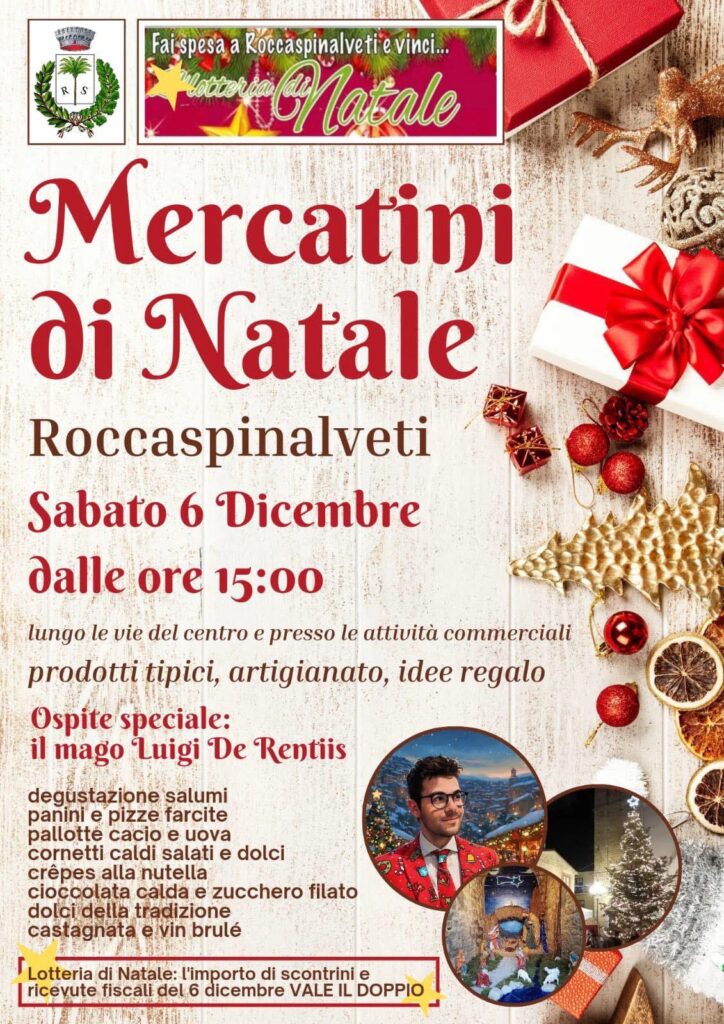 A Roccaspinalveti il Natale inizia molto presto. Sabato 6 dicembre, dalle ore 15:00, il centro storico si trasformerà in un piccolo villaggio festoso per i Mercatini di Natale, tra prodotti tipici, artigianato e idee regalo.