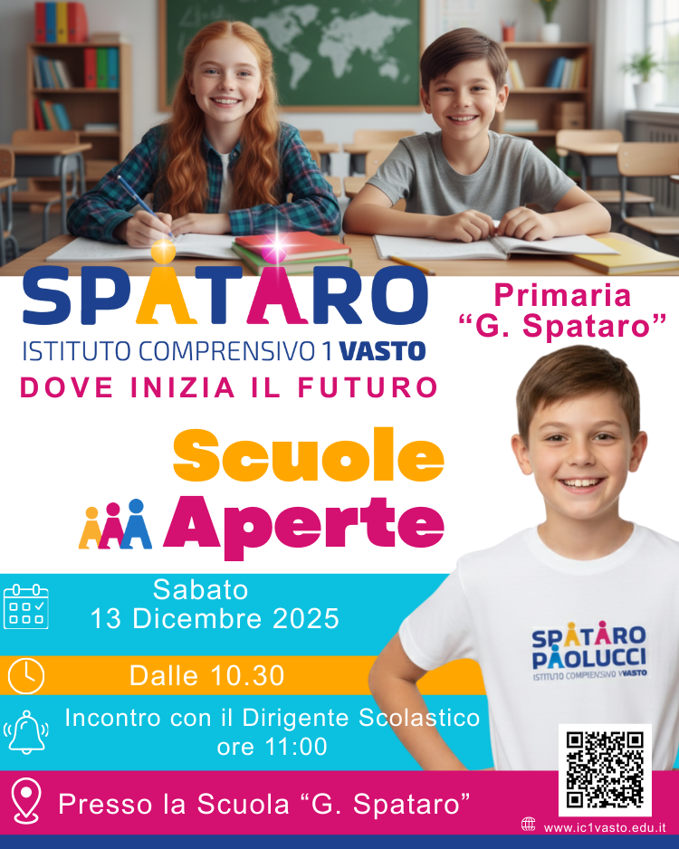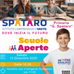 L’Istituto Comprensivo 1 Vasto “Spataro Paolucci”, nell’anno in cui celebra il suo 60° anniversario, invita genitori e futuri alunni all’appuntamento con l’Open Day in programma Sabato 13 Dicembre 2025.