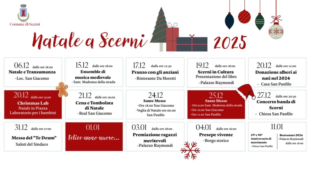 “Pronto il Calendario degli Eventi Natalizi di Scerni, un programma essenziale ma ricco di calore pensato per rafforzare il senso di comunità e vivere insieme lo spirito del Natale.