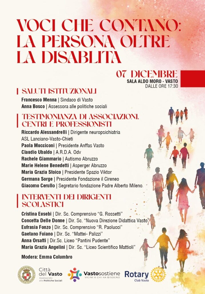 Per questo il Comune di Vasto insieme con il Rotary Club ha inteso organizzare una tavola rotonda dal titolo “Voci che contano: la persona oltre la disabilità”, in programma il 7 dicembre, alle ore 17:30, presso la Sala Aldo Moro.