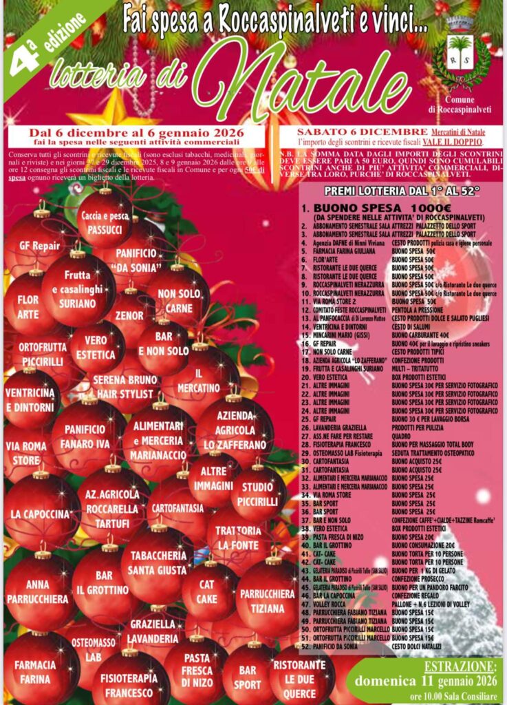 A Roccaspinalveti ogni acquisto può diventare un biglietto fortunato. Dal 6 dicembre al 6 gennaio , chi farà spesa nelle attività del paese e conserverà i vari scontrini potrà partecipare alla Lotteria di Natale.