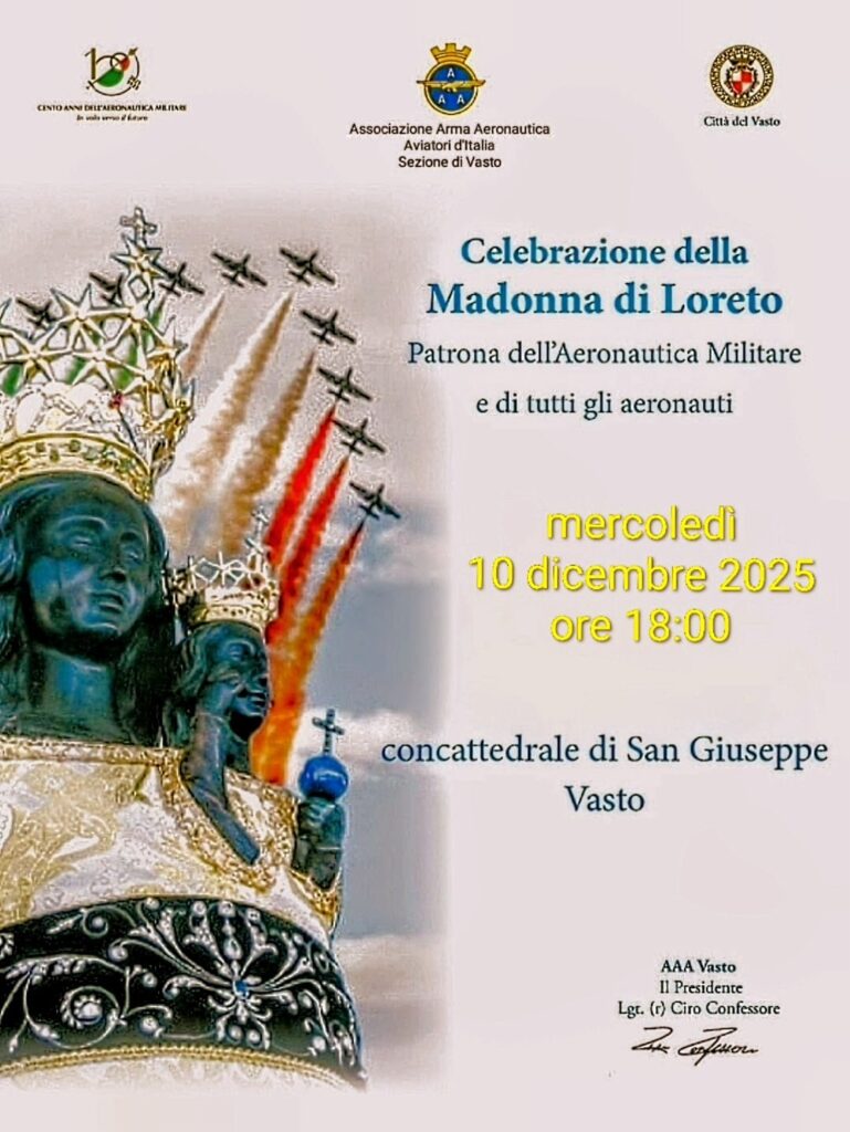 Come ogni anno anche questo dicembre a Vasto si rinnova la commemorazione della Madonna di Loreto Patrona dell’Aeronautica. Durante la messa di mercoledì 10 dicembre delle ore 18:00 nella concattedrale di San Giuseppe a Vasto, l’Associazione Arma Aeronautica Aviatori d’Italia Sezione di Vasto celebrerà la Madonna di Loreto Patrona dell’Aeronautica Militare e di tutti gli Aeronauti. Verrà rivolto un pensiero ai Soci che hanno chiuso le ali e a tutti i caduti dell’aria e letta la Preghiera dell’Aviatore.
