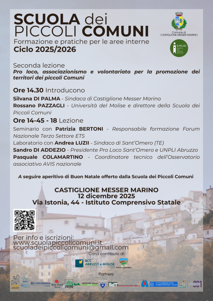 Come al solito la lezione sarà seguita dalla parte laboratoriale, che per l’occasione ospiterà il sindaco di Sant’Omero (TE), Andrea Luzii accompagnato dal presidente della Pro Loco del centro teramano e presidente UNPLI Abruzzo, Sandro Di Addezio che illustreranno l’esperienza virtuosa di collaborazione tra la Pro Loco e l’amministrazione comunale, peraltro in linea con il trend regionale: in Abruzzo, il 97% di queste associazioni dichiara di collaborare fattivamente con i comuni. Interverrà anche Pasquale Colamartino, coordinatore tecnico dell’Osservatorio associativo di AVIS nazionale, per raccontare come questa rete associativa si interfaccia con le comunità che vivono nelle aree interne. Gli incontri sono aperti a tutti ed è possibile iscriversi direttamente visitando il seguente link: https://scuolapiccolicomuni.it/iscrizioni_2526/