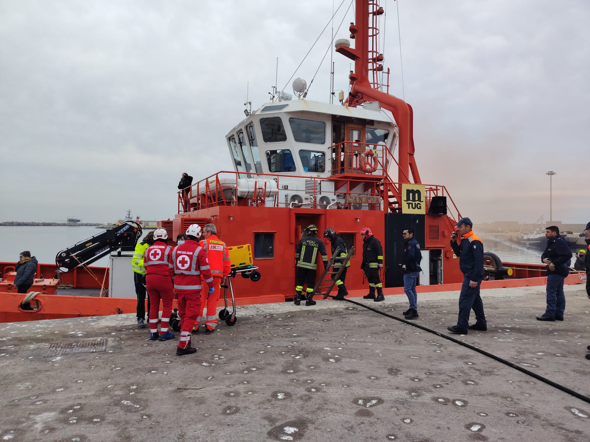 Si è simulato un principio di incendio avvenuto a bordo del Rimorchiatore Canada, messo a disposizione dalla Società Sers, ormeggiato nello stesso bacino portuale, con il conseguente ferimento di due marittimi, di cui uno in forma grave.