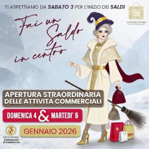 I saldi prenderanno ufficialmente il via da sabato 3 gennaio, con un calendario di aperture straordinarie pensate per rendere ancora più vivo e accessibile il cuore commerciale della città.
