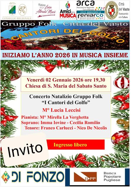 Un altro grande e più impegnativo evento natalizio è stato quello realizzato venerdì 2 gennaio nella chiesa di Santa Maria del Sabato Santo con il patrocinio del Consiglio Regionale e dell’ Assessorato alla Cultura Città del Vasto; con la collaborazione della Fondazione N.D. Luisa Altruda Muzii e dell’ Associazione Amici della Musica; un importante contributo è stato offerto da Di Fonzo Viaggi e da Banca Popolare Pugliese.