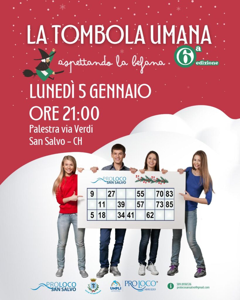 L’appuntamento è per lunedì 5 gennaio, a partire dalle ore 20:00, con l’apertura della vendita delle cartelle. Dalle 21:00, via all’estrazione dei numeri su un tabellone gigante di 8×8 metri… composto da 90 persone vere che interpreteranno i numeri della tombola, pronte a coinvolgere il pubblico in una serata fatta di sorrisi, emozioni e sorprese.