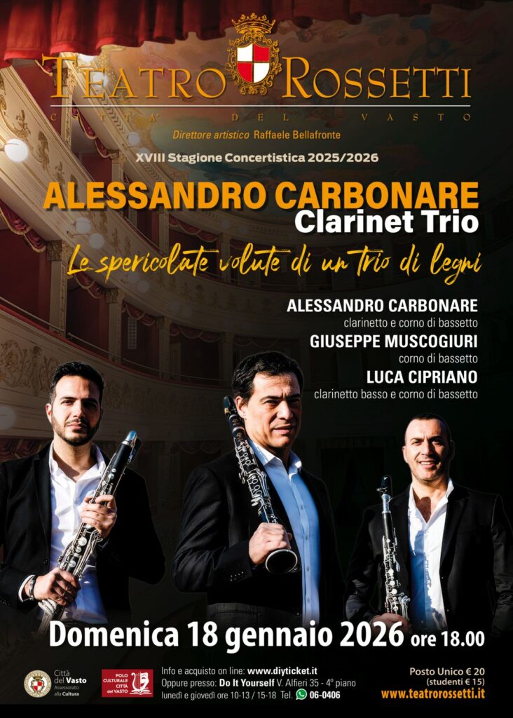 Domenica 18 gennaio 2026, alle ore 18:00, il Teatro Rossetti di Vasto ospiterà il concerto “Le spericolate volute di un trio di legni”, con protagonista l’Alessandro Carbonare Trio. La formazione, ideata dal celebre clarinettista Alessandro Carbonare, solista di fama internazionale e primo clarinetto dell’orchestra dell’Accademia nazionale di Santa Cecilia, è completata da Luca Cipriano e Giuseppe Muscogiuri, musicisti di alto profilo artistico. Un ensemble tanto inconsueto quanto versatile, capace di attraversare con originalità epoche e linguaggi musicali differenti. Il programma spazia dai rarissimi Divertimenti per tre corni di bassetto di W. A. Mozart alle variazioni di Beethoven, includendo incursioni nella musica contemporanea, nel jazz, fino all’energia trascinante della tradizione klezmer, cifra distintiva dei concerti del trio.