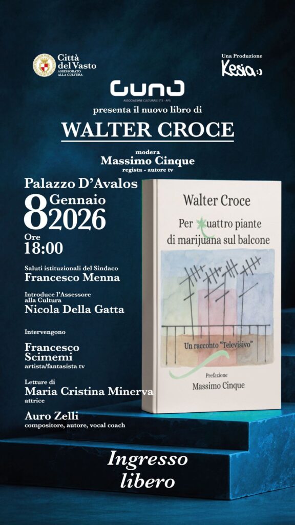 Oggi, giovedì 8 gennaio, alle ore18:00, Palazzo D’Avalos a Vasto ospiterà la presentazione del volume «Per quattro piante di marijuana sul balcone. Un racconto televisivo» di Walter Croce, con prefazione di Massimo Cinque. Si tratta dell’unica tappa abruzzese di un tour nazionale che sta attraversando l’Italia.