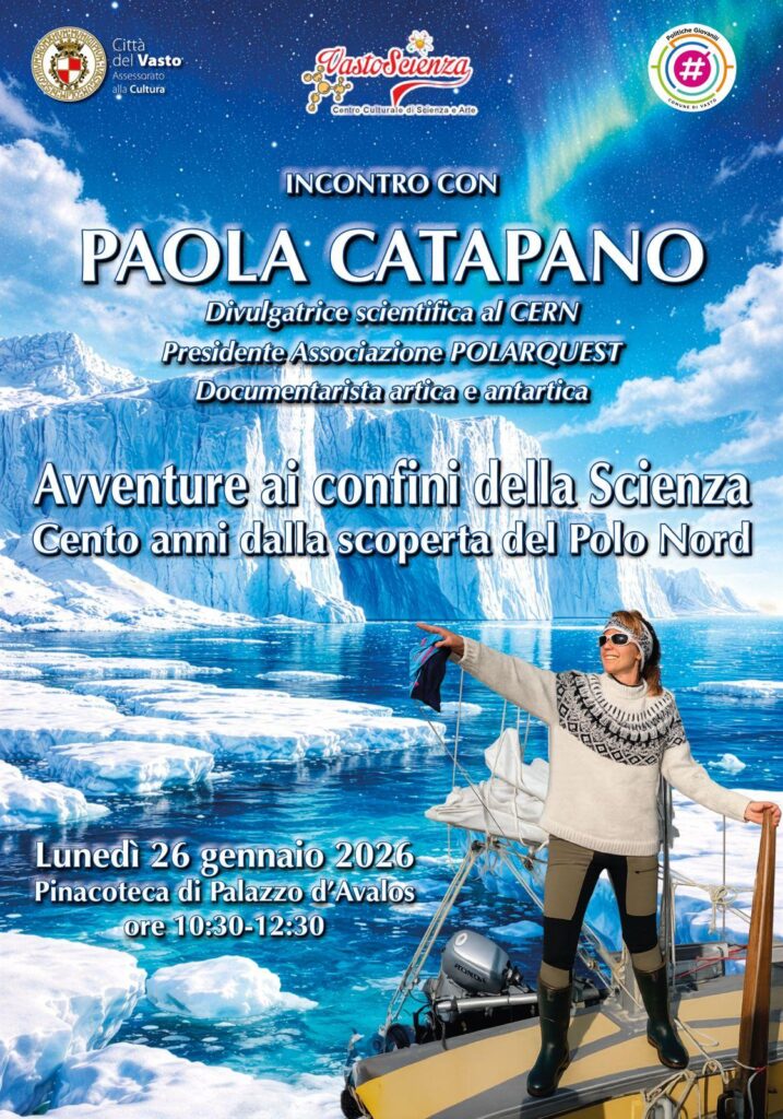 Si terrà il 26 gennaio 2026, alle ore 10:30, nella Pinacoteca di Palazzo d’Avalos, l’incontro “Avventure ai confini della Scienza. Cento anni dalla scoperta del Polo Nord” con Paola Catapano, divulgatrice scientifica al Cern di Ginevra e documentarista artica e antartica. L’iniziativa, organizzata dal Centro Culturale VastoScienza nell’ambito del ciclo Onde di Scienza, è patrocinata dagli assessorati alle Politiche giovanili e alla Cultura del Comune di Vasto. L’incontro rappresenta un’importante occasione di divulgazione scientifica e approfondimento culturale, rivolta in particolare ai giovani e agli studenti delle scuole superiori, ma aperta a tutta la cittadinanza. Attraverso il racconto delle grandi esplorazioni polari e dell’attualità della ricerca scientifica, l’appuntamento intende stimolare curiosità, senso critico e interesse verso le discipline Steam, celebrando il centenario delle imprese al Polo Nord e la storica spedizione del dirigibile Italia guidata dal generale Umberto Nobile.