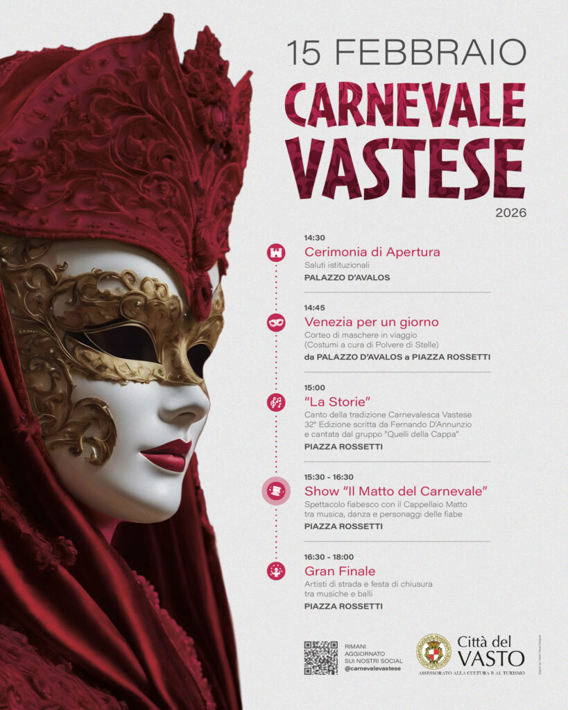 Il Comune di Vasto – Assessorato alla Cultura e al Turismo presenta il Carnevale Vastese 2026, in programma il 15 febbraio, un pomeriggio di eventi che intreccia tradizione, spettacolo e partecipazione cittadina, in una città da sempre ricca di cultura, storia e iniziative.