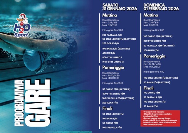 Si partirà sabato mattina con in vasca gli atleti e le atlete impegnati nelle batterie dei 200 farfalla, 50 stile, 200 dorso, 100 rana, 400 misti, 800 stile, 1500 stile. Nel pomeriggio spazio per i 50 dorso, 400 stile, 100 farfalla e 200 rana. A seguire ci saranno le finali dei 50 stile, 100 rana, 50 dorso e 100 farfalla. Domenica mattina a partire dalle ore 9 sono in programma le batterie dei 100 dorso, 200 stile, 50 farfalla e 200 misti. Nel pomeriggio si tornerà in vasca per andare all’assalto delle finali nei 100 stile e 50 rana. Poi ci saranno le finali dei 100 dorso, 50 farfalla, 100 stile e 50 rana.