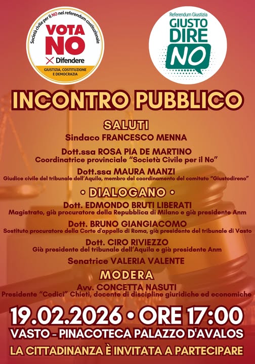 Giovedì 19 febbraio 2026, alle ore 17:00, nella Pinacoteca di Palazzo d’Avalos, si terrà l’incontro promosso dalla “Società Civile per il No” della Provincia di Chieti e dal comitato “Giustodireno”, per parlare del referendum sulla riforma della giustizia proposta dal Governo Meloni e dal Ministro Nordio, in programma il 22 e il 23 marzo. Una riforma della giustizia che indebolisce i diritti e altera l’equilibrio costituzionale dei poteri.
