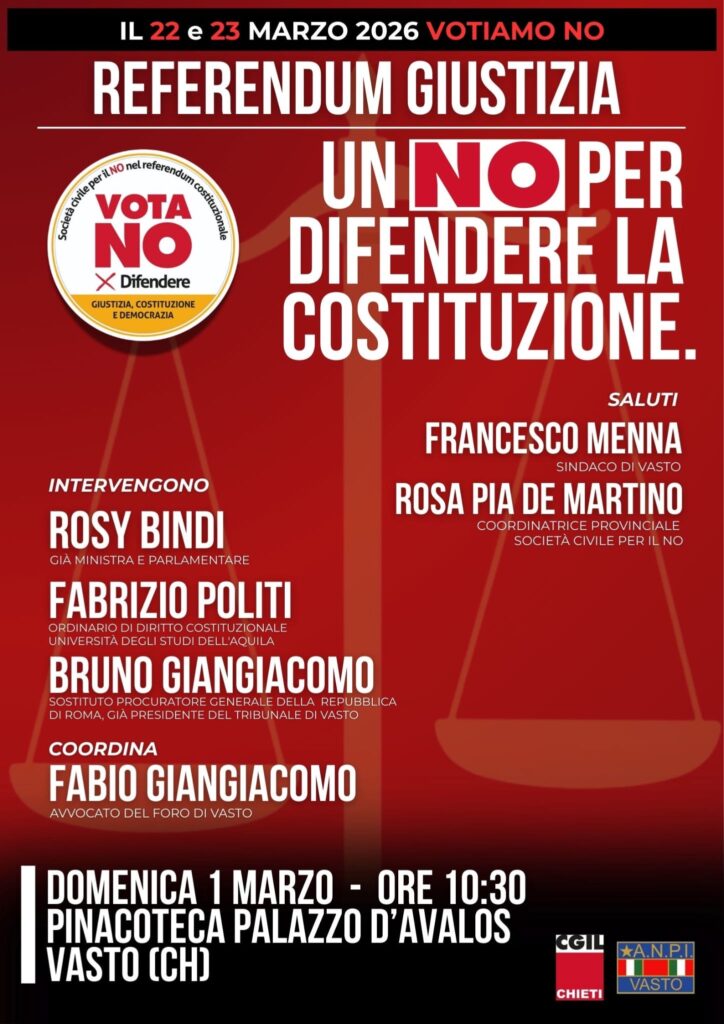 Domenica 1 marzo 2026, alle ore 10:30, nella Pinacoteca di Palazzo d’Avalos a Vasto, un nuovo incontro pubblico dedicato al Referendum sulla giustizia previsto per il 22 e 23 marzo, dal titolo “Un NO per difendere la Costituzione”.