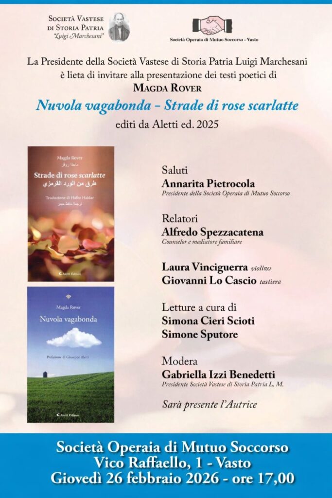 Modera i lavori Gabriella Izzi Benedetti, presidente della Società Vastese di Storia Patria, che dichiara: “La nostra socia Magda Rover ha mostrato negli anni una continuità di sentire poetico ricco di spunti lirici e riflessioni di profonda partecipazione umana e sociale. Attraverso i fili della memoria Magda approda al presente in un continuo riandare e riannodare e mai perdendo di vista il senso profondo del vivere, la magia dell’amore, il prolungamento di una “familiarità” che continua a essere l’elemento portante della sua capacità rielaborativa ed espressiva”.