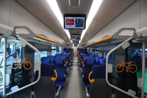 Persone a ridotta mobilità – Il treno è dotato di due postazioni per persone con disabilità, strategicamente collocate nelle immediate vicinanze delle porte di accesso e dei servizi igienici, così da ridurre al minimo gli spostamenti necessari.
