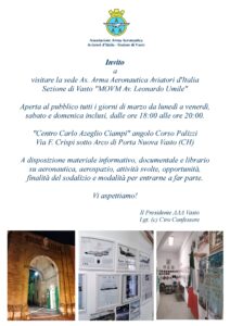 Sarà aperta al pubblico tutti i giorni di marzo da lunedì a venerdì con sabato e domenica inclusi, dalle ore 18:00 alle 20:00, la sede dell’As. Arma Aeronautica Aviatori d’Italia Sezione di Vasto nel “Centro Carlo Azeglio Ciampi” angolo Corso Palizzi Via F. Crispi, sotto l’Arco di Porta Nuova a Vasto.