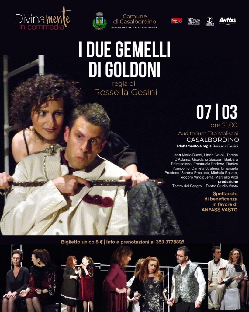 Sabato 7 marzo, alle 21, nell’Auditorium “Tito Molisani” di Casalbordino, prenderá il via una serie di spettacoli di beneficenza del Teatro del Sangro-Teatro Studi Vasto e dell’associazione Joseph a sostegno del laboratorio teatrale di Anffas Vasto.