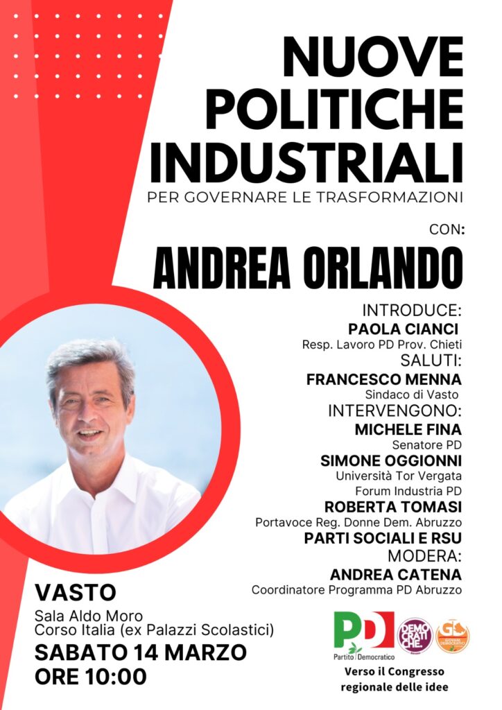 Si terrà sabato 14 marzo, a Vasto, presso la Sala Aldo Moro in Corso Italia, con inizio alle ore 10, l’iniziativa dal titolo “Nuove politiche industriali per governare le trasformazioni”, un momento di confronto pubblico dedicato alle sfide e alle prospettive dello sviluppo produttivo e industriale nel nostro territorio.