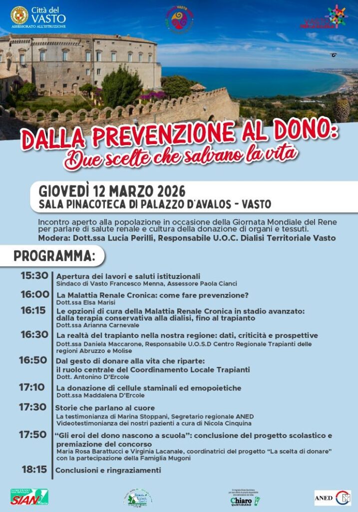 L’iniziativa è promossa dal Comune di Vasto, dal Reparto di Nefrologia – Dialisi di Vasto (ASL Lanciano – Vasto – Chieti), da ANED e AIDO.