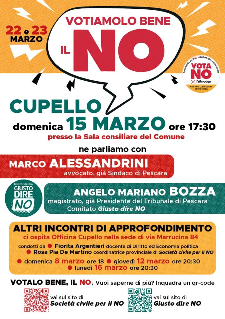 In vista della consultazione referendaria del 22-23 marzo, Società civile per il NO organizza, domenica 15 marzo alle ore 17:30, un incontro pubblico presso la Sala consiliare del Comune di Cupello.